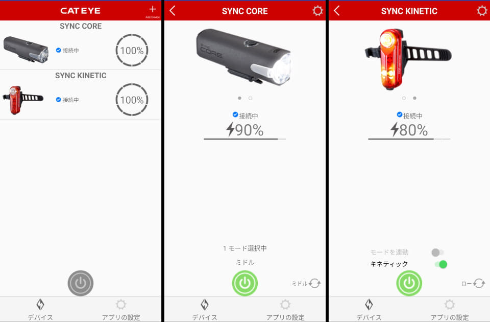 というわけでSYNC COREとSYNC KINETICのセット、なんといっても面白いのは両方ともスマホ対応であること。専用スマホアプリからデバイス登録すればBluetoothで遠隔からコントロールできる。電源のオンオフやモード(明るさや点灯・点滅の)切り替えが可能で、現在のバッテリー残量も分かる。
