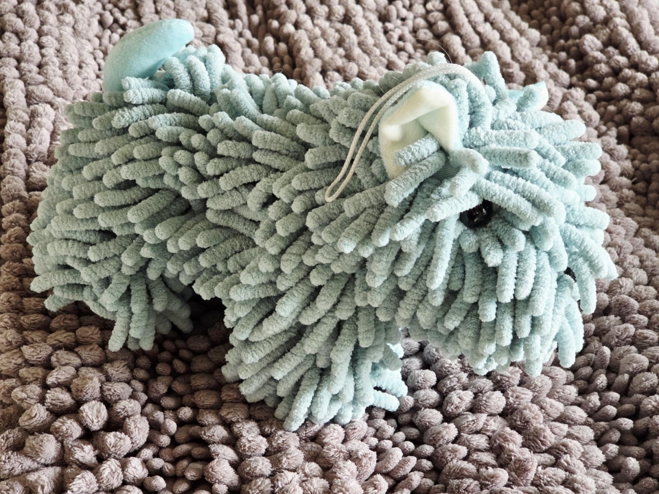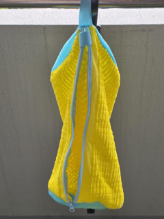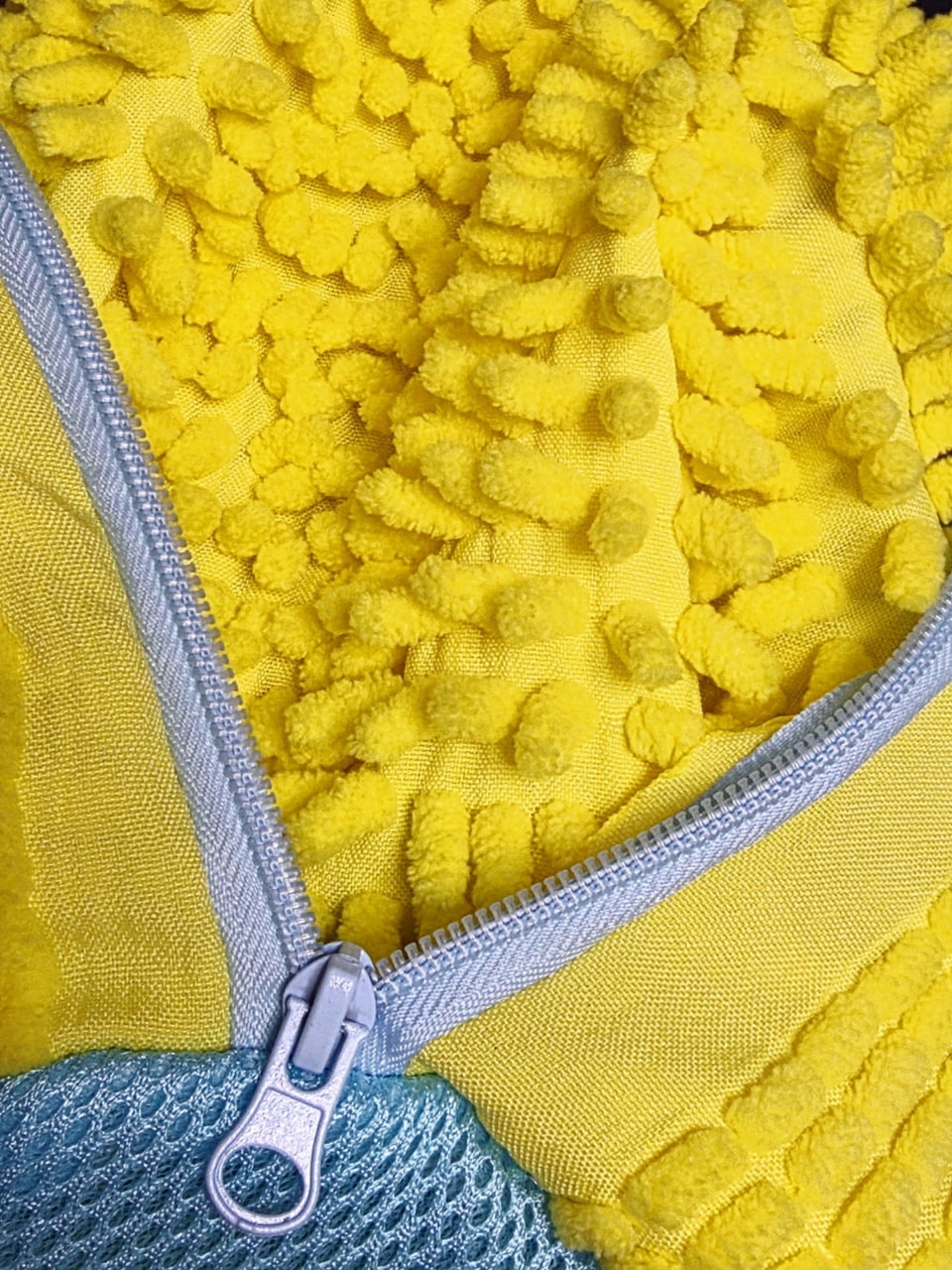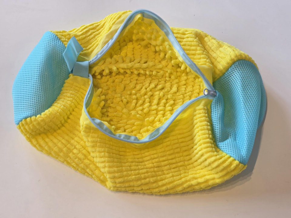 “チンアナウォッシュ”は円筒形のフォルムにジッパーが走り、スニーカーをペアで収納できる。外側は黄色と水色のツートンカラー、内側には無数の短い繊維が密集している。この繊維がまるで“チンアナゴ”の群れのように見えるため、筆者はこの愛称を付けたわけだ。