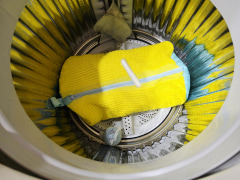 特別なモードを選ばなくても、しっかりとした水流とモコモコ繊維の摩擦で汚れが落ちていく。洗濯終了後はファスナーを開き、スニーカーを取り出してベランダで干す。バッグ自体も一緒に洗えているので、そのまま吊り下げて乾燥させるだけだ。