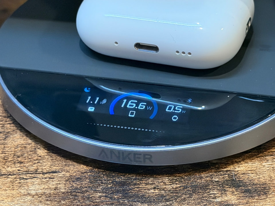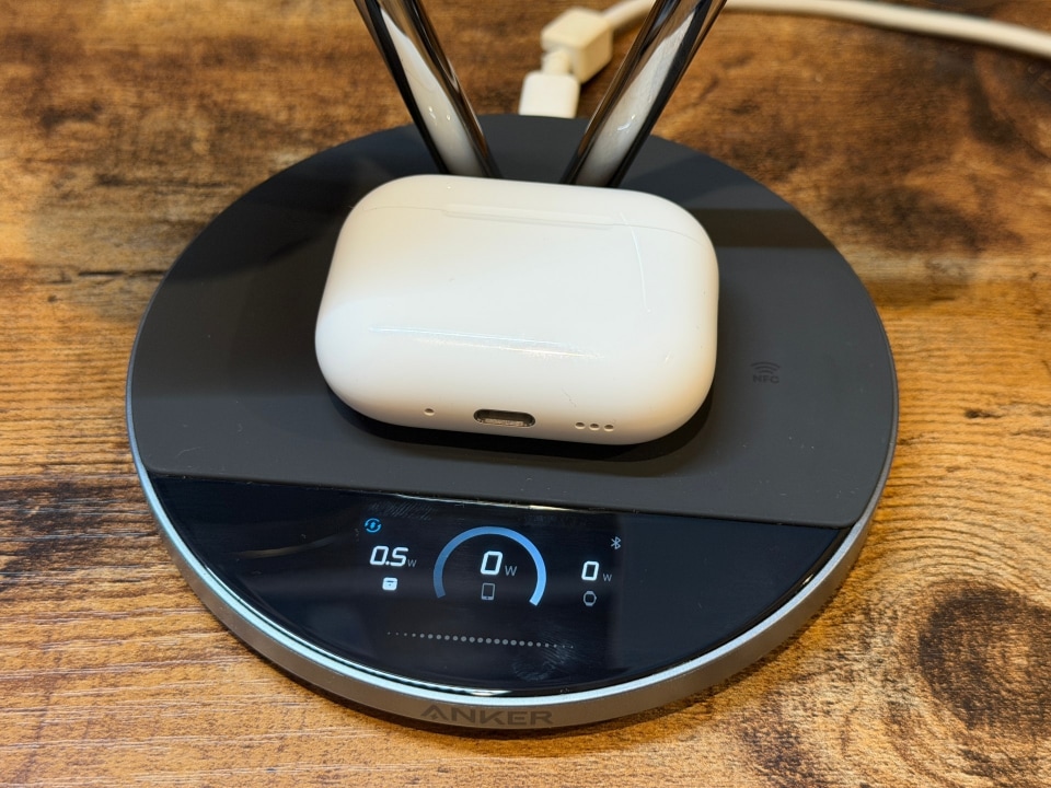 スマートフォン用充電器は、Qi2 25W認証を取得しており、最大25W出力となります。対応スマートフォンこそ少ないものの、最新規格に対応しているのは、さすが上位モデルといったところでしょう。90度近い角度調節もできるので、iPhoneのスタンバイモードを多用する筆者にとっても、使いやすい製品となっています。