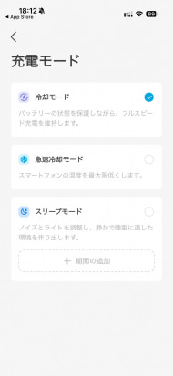 充電時には、充電速度と冷却性能を両立する「冷却モード」、より温度上昇を抑制する「急速冷却モード」、冷却ファンやディスプレイをオフにする「スリープモード」が選択できます。状況に合わせて利用方法をカスタマイズできるのも、他にあまりないポイントです。