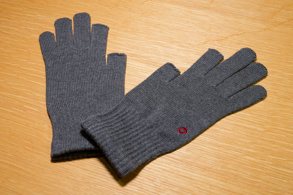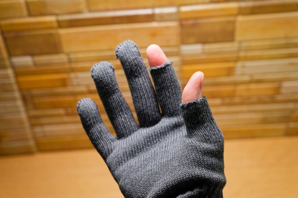 選んだのは、今までもお世話になってきた「冷えとり靴下の841」の「ハンドウォーマー 2フィンガー」。スマホでよく使う親指と人差し指の2本だけが指ぬきになっていて、それ以外は普通の手袋だ。素材は大半が綿で、ふんわり柔らかい。3本の指がちゃんと隠れるだけで、これまでとは段違いに温かく感じられる。