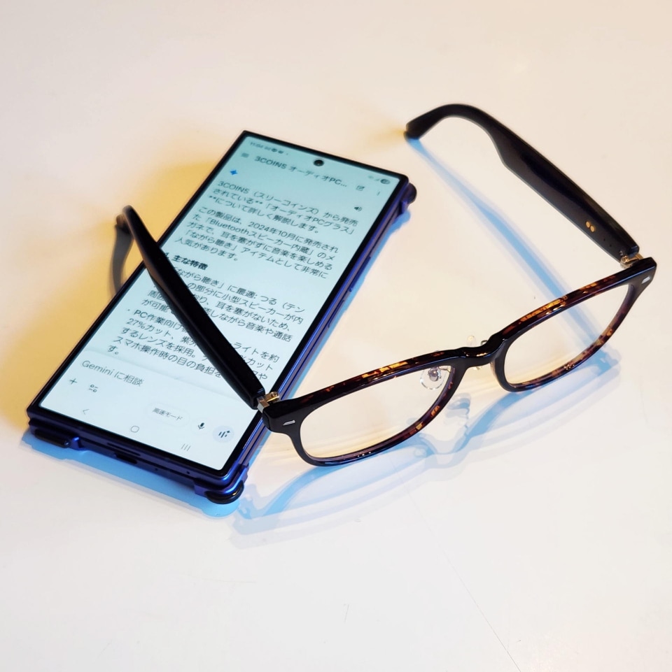 そんな筆者が、ある日JR上野駅エキナカの3COINSに立ち寄り、ふと目に留めたのが「AUDIO PC GLASSES」だった。左右の眼鏡のツルに極めて小さなスピーカーを内蔵した、眼鏡型のBluetoothオーディオである。自分の嗜好とは真反対側に居る骨伝導やオープンイヤーのイヤフォンに興味もあった。