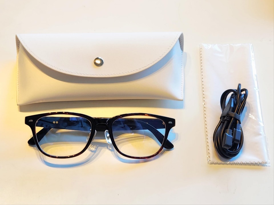 今回購入したのは3COINSの「AUDIO PC GLASSES」という製品だ。付属品は眼鏡本体の他にはUSB充電ケーブル、メガネクリーナー、眼鏡ケースというシンプルな構成である。