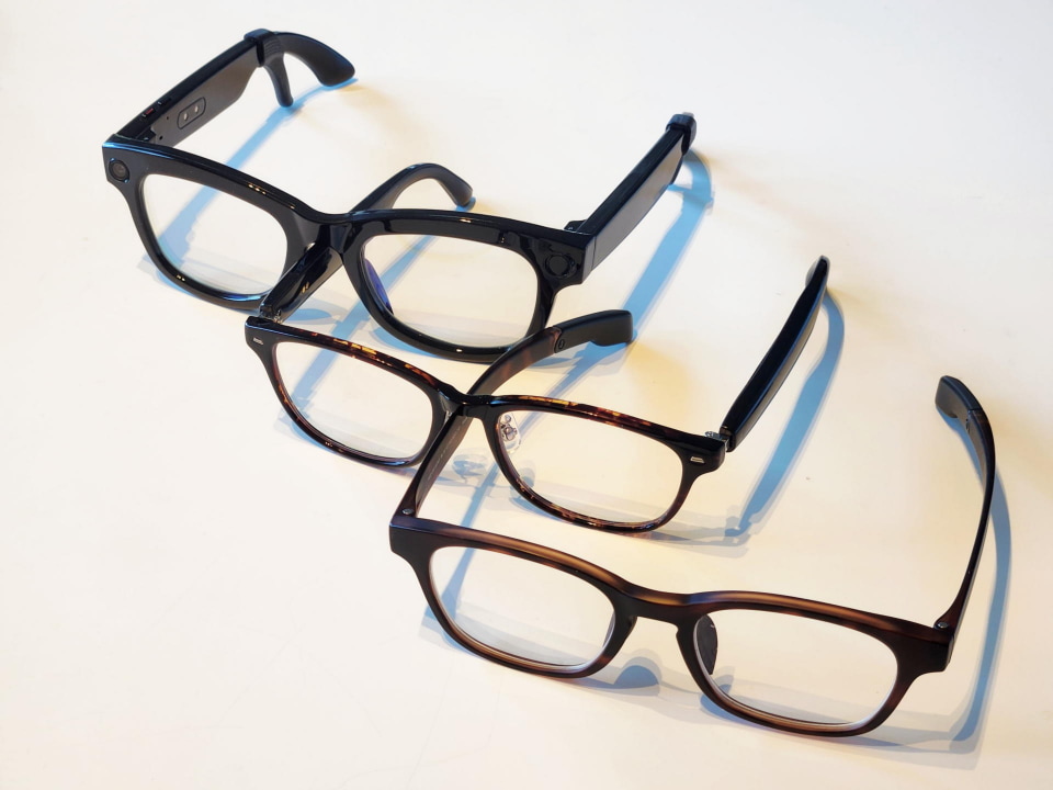 昨今のAIスマートグラスのように、ひと目で「ガジェット」と分かる主張の強さはない。中央が今回の商品だ。前後は普通の眼鏡とAIスマートグラス。