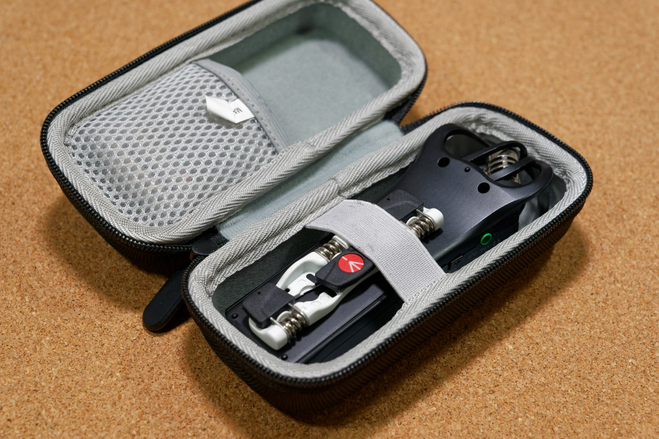 まずはマンフロットの超ミニミニな三脚「POCKET三脚S MP1」。取材で使うICレコーダーに装着する目的で購入したものだ。ICレコーダー本体をテーブルなどに直置きしてしまうと、テーブルの振動とかがダイレクトに伝わって聞き苦しい音質になるので、脚になるものは必須。それでいて持ち運び用のケースに収まるようにしたい、となると、ほとんどこれ一択ではないか、と思う。
