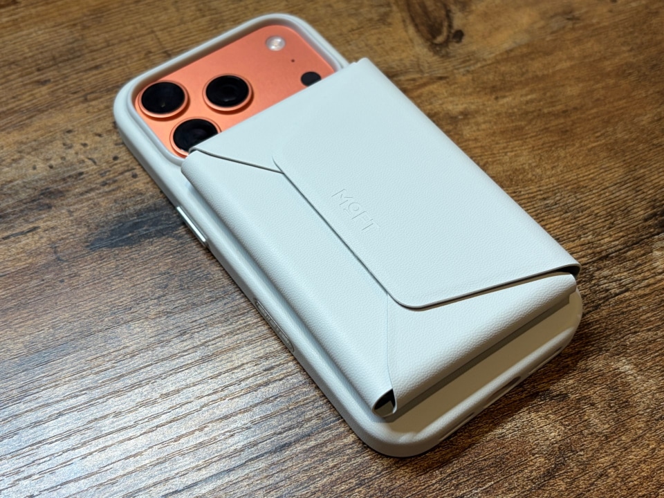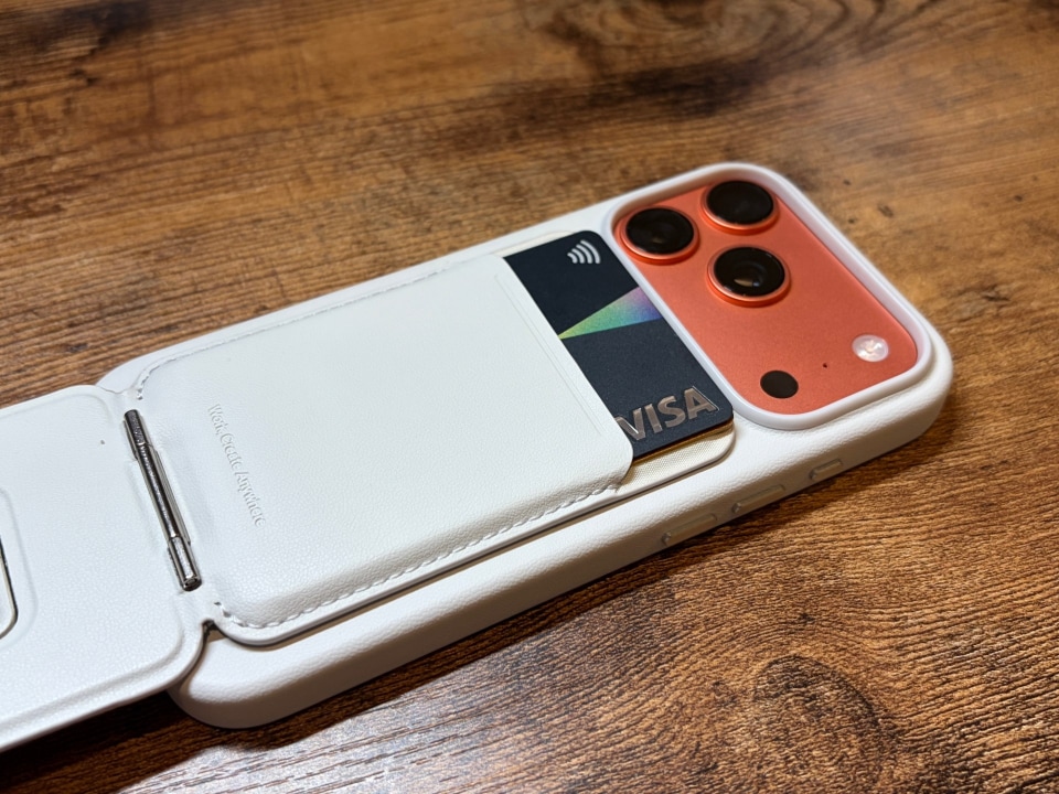 最大8枚のカードが入る大容量だけに、それなりの厚みがあるため、iPhone 17 Proの背面に取り付けていると、どうしても持ちにくさは増してしまいます。