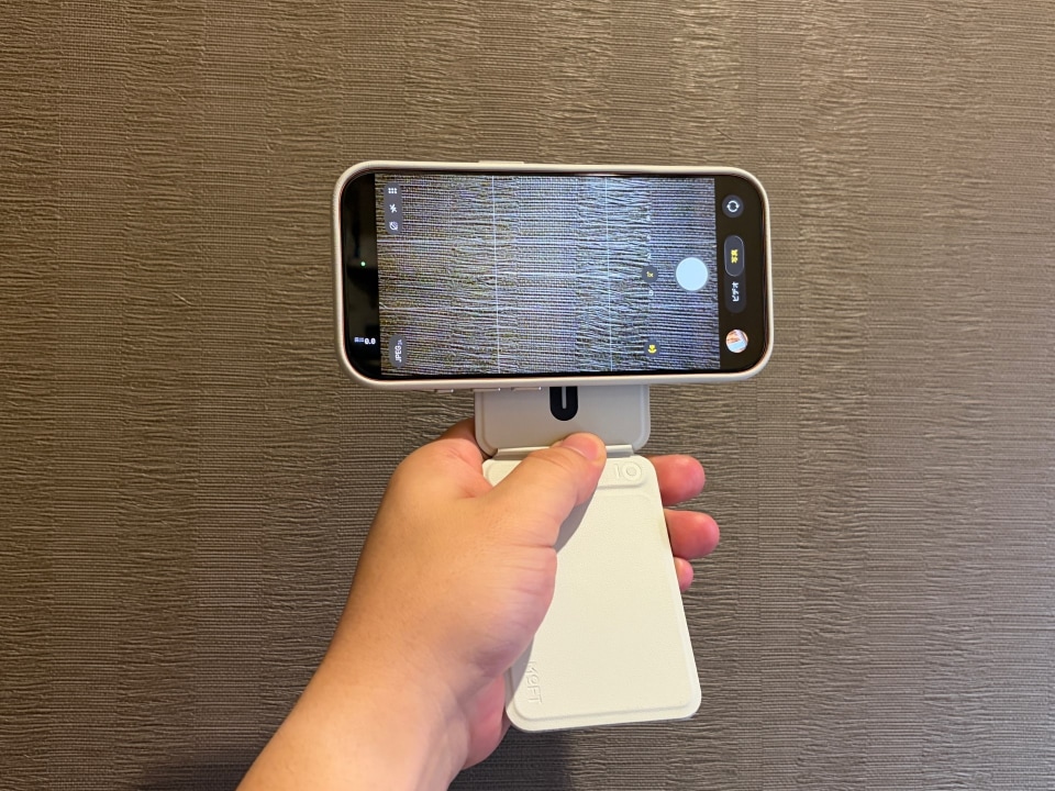 高さがあるため、安定性には若干不安がありますが、使用している限り、iPhone 17 Pro本体が外れてしまったり、不意に倒れてしまうこともありません。MagSafeで取り付けられるため、縦方向、横方向のどちらでも使えるのもポイントです。
