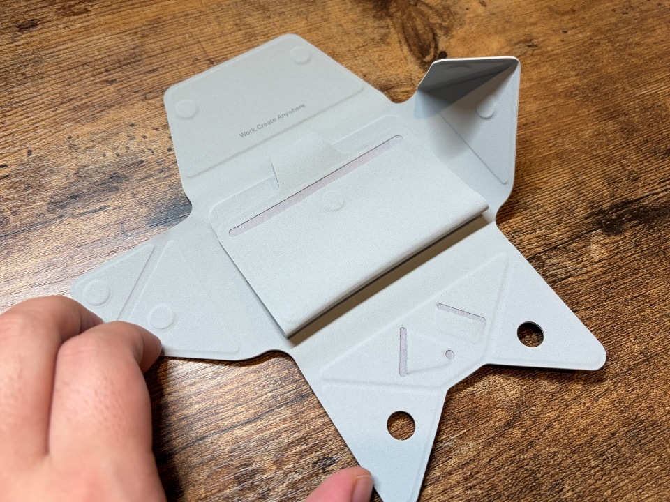 もう1つのMagSafe対応アクセサリーが、多機能カードケース&スタンド。こちらはスタンドとして使用する場合は、高さは1段階で、角度の調節はできませんが、代わりに収納力に優れているのが特徴です。