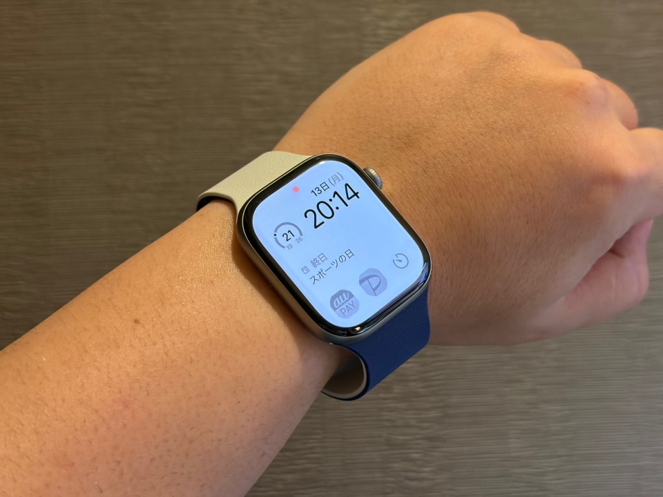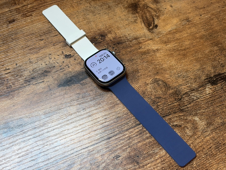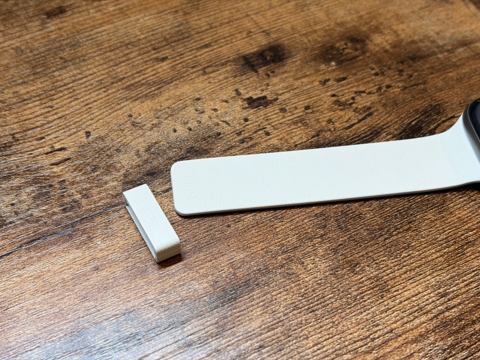 本体はレザー調の素材になっており、指紋や汚れの付着はほぼありません。1週間ほどつけている感覚としては、引っ掻き傷などもあまりつかない印象です。レザーらしい柔らかい感触で、さらっとした手触りではありますが、滑りやすいというほどではないため、十分実用的です。