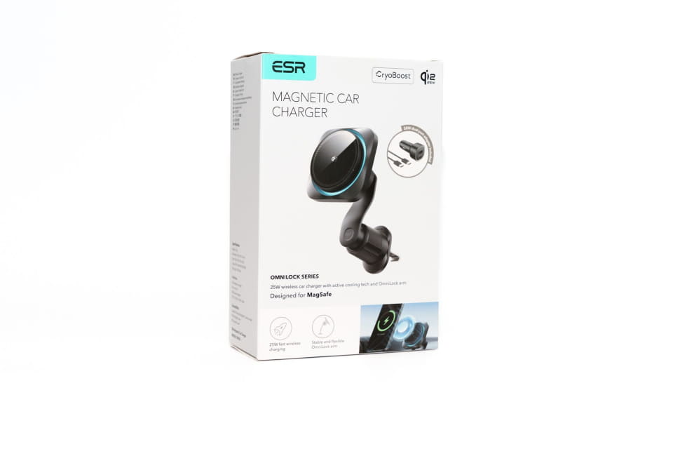 今回試した製品の正式名称は「ESR OmniLock マグネット車載充電器(Qi2.2、CryoBoost、エアコン吹き出し口)」。製品名から分かるように、ワイヤレス充電の最新規格「Qi2.2」を採用し、最大25Wの高出力に対応したワイヤレス充電器です。