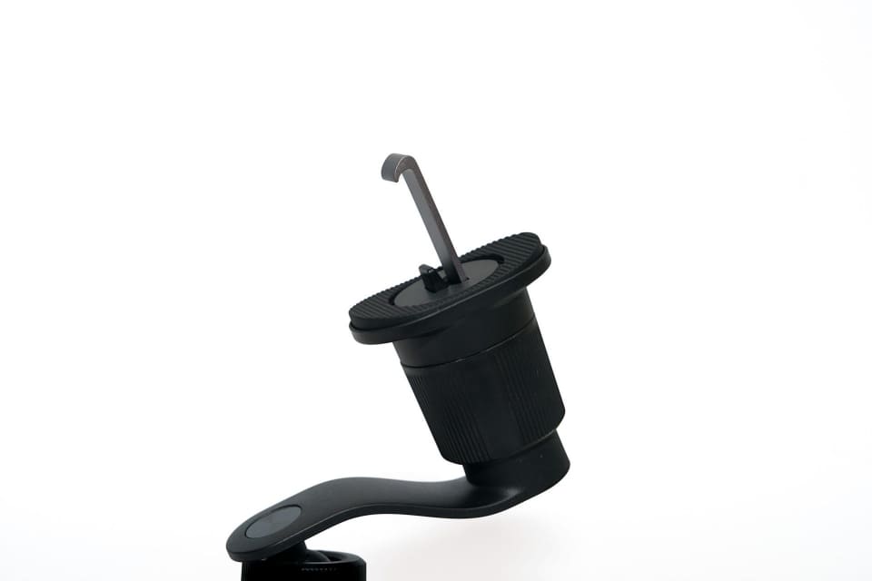 充電器本体とフックは特許を取得したという360度回転アーム「OmniLock」でつながっていて、運転姿勢や視界に合わせて自在に調節できる仕組みです。