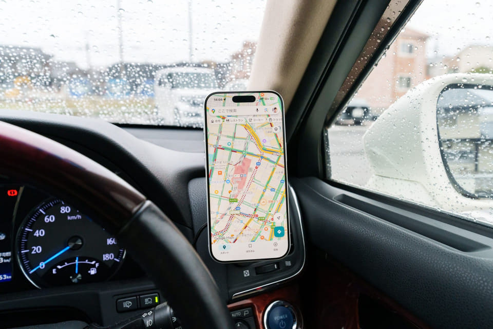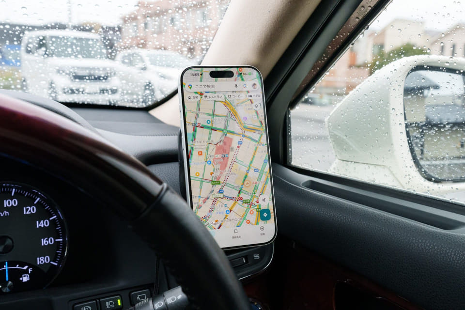 ここ数年の車は、iPhoneの「CarPlay」やAndroidの「Android Auto」などスマートフォン連携機能が搭載されていますが、筆者が所有している車はあいにく非対応。取り外しできない構造のため、カーナビを入れ替えることもできず、MagSafe対応のカーチャージャーを使ってiPhoneをカーナビ代わりとして活用しています。
