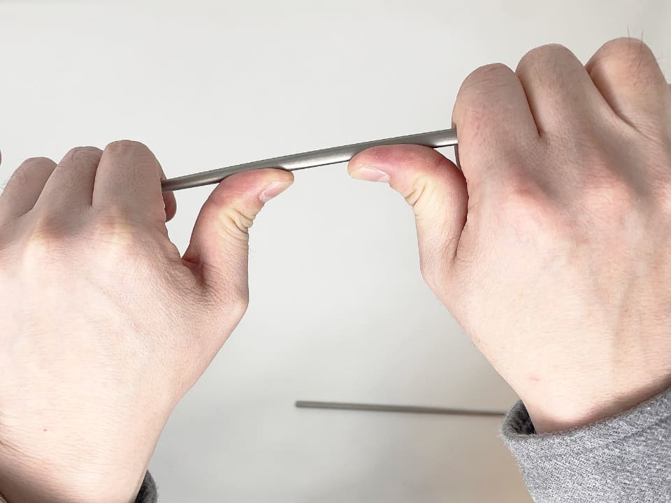 軽くて丈夫、という性質は知っていたものの、実際に手に取ったときはその軽さに驚きました。見た目から韓国料理店などで供される金属製の重たい箸を想像していたところ、実際は木やプラスチック製の箸と遜色のない重さなのです。両手で曲げようとしてもちょっとやそっとでは反りすらしないくらい丈夫なので、耐久性も間違いなさそうです。また食べ物が入り込むような継ぎ目もないので衛生的にも安心です。
