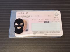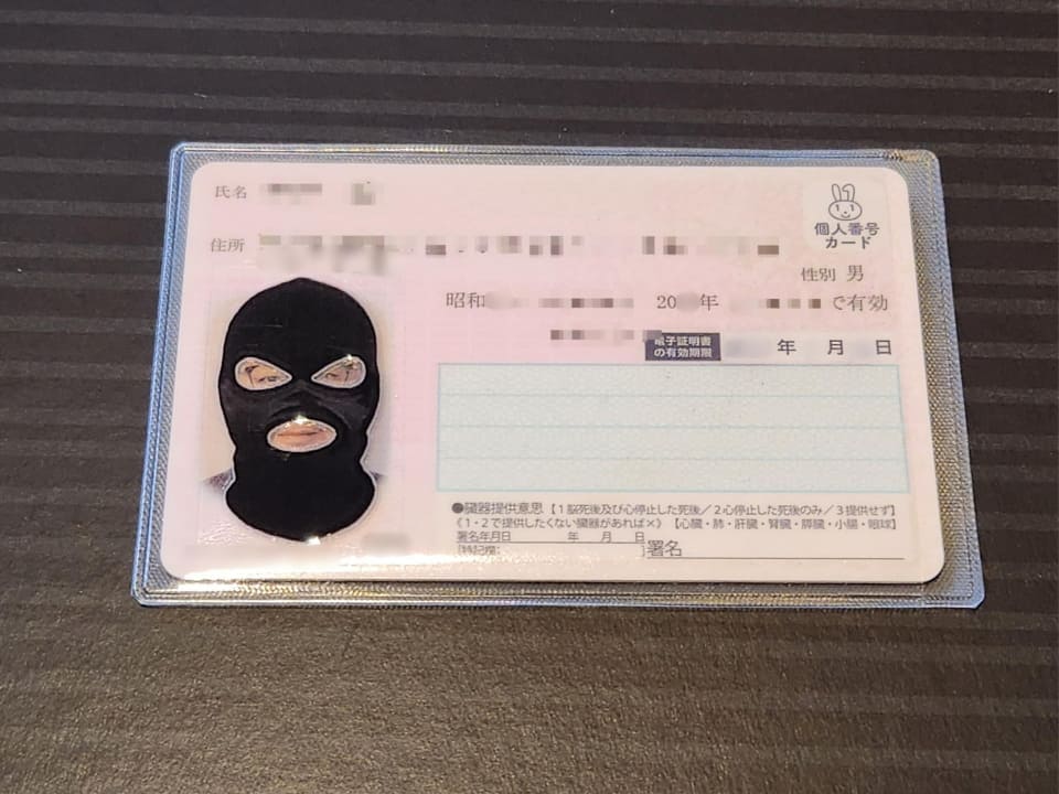 今回は、そのキットを使ってマイナンバーカード用の「覆面ケース」を実際にカスタマイズしてみた。目出し帽の形状が絶妙で、顔の写真部分に合わせて貼り付けると、目と口だけが露出する“完全覆面仕様”のマイナンバーカードが完成する。実にシュールで、インパクトは絶大だ。