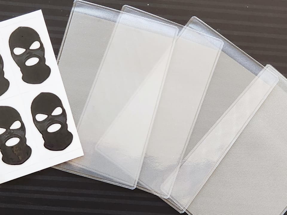 今回入手したのは、“黒い目出し帽”のようなデザインシール6枚と、それを貼り付けて任意の部分を隠せる汎用ビニールケース6枚がセットになったキットである。