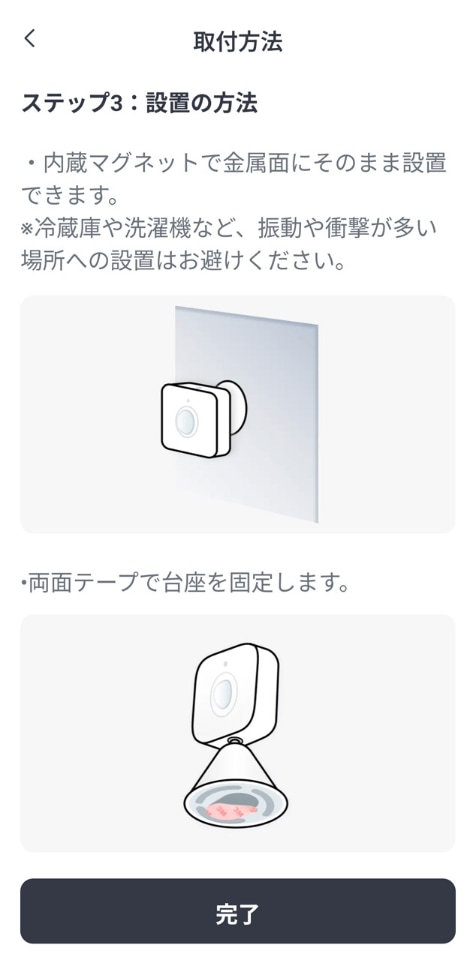 準備は、検知したい方向に向けて設置し、アプリと連携してキャリブレーション的な初期設定を行なうだけ。直置きのほか、両面テープや付属スタンド(マグネット内蔵)を使った壁・金属面などへの設置が可能だ。