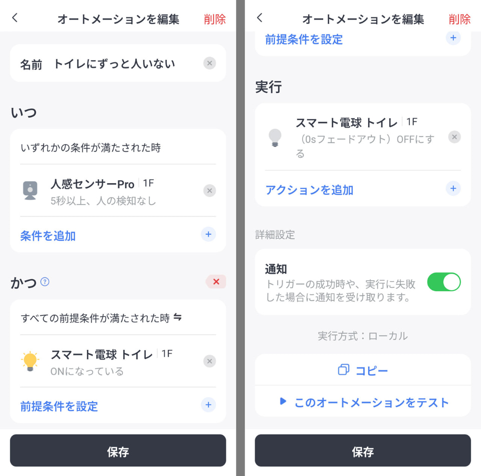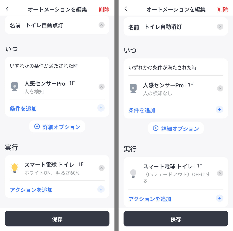 照明側の準備が整ったらアプリで「オートメーション」の設定へ。単純に「人感センサーProで人を検知→照明をオン」と、「人感センサーProで人がいないことを検知→照明をオフ」の2パターンを作成すれば、とりあえずは「トイレに入ったら照明がつき、出たら照明が消える」という自動化ができる。もちろん、トイレで座っている間、身じろぎせず力んでいても照明が消えることはない。