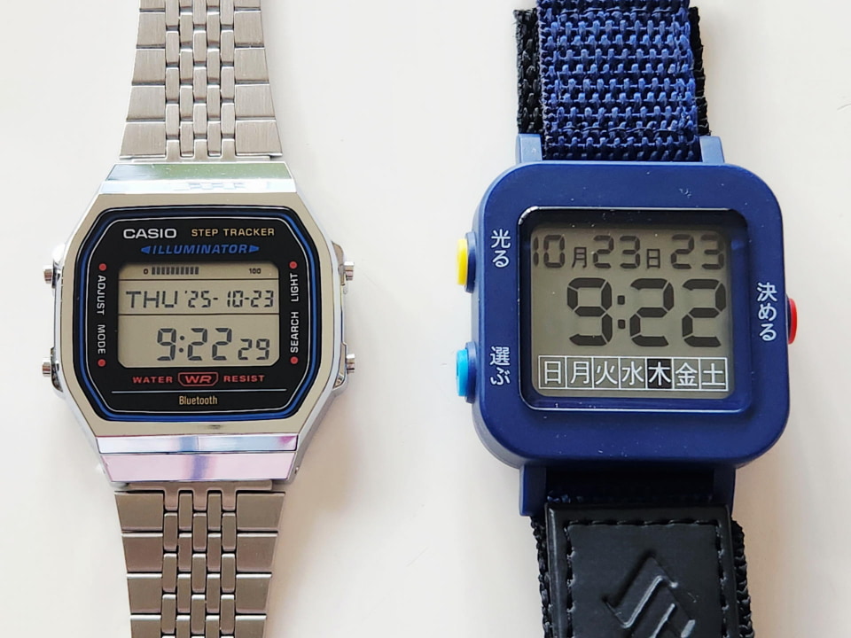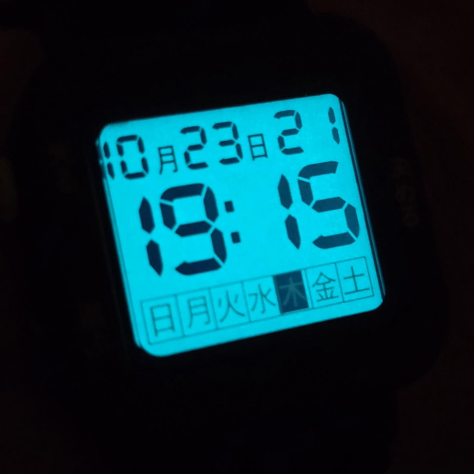 今回筆者が選んだデジタルモデルにおいても、その思想は徹底されている。まず、時刻を表示するデジタルフォントが、一般的な液晶時計よりも圧倒的に太く、大きい。そして最大の特徴は、曜日表示などが「日月火水木金土」という日本語表記である点だ。