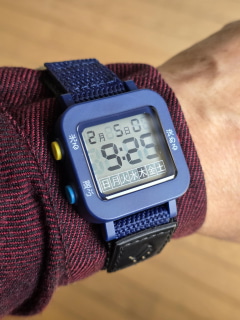 今回筆者が購入したのは、腕時計メーカーであるサン・フレイムが「お客様の『声』をかたちにしました!」と銘打って展開している「やさしい時計」である。ラインアップにはブラックとブルー(ネイビー)の2色が存在するが、今回はそのガジェットらしい佇まいに惹かれ、ブルーモデルを選択した。