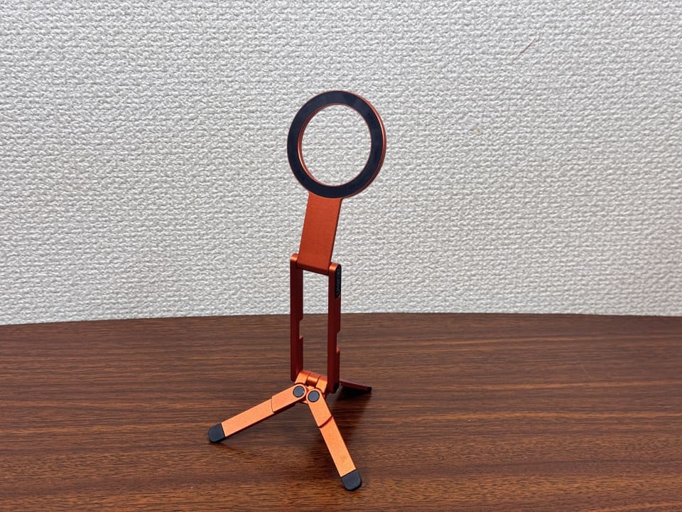 足を開くと三脚モードとして使うことが可能。撮影用ということもあり、一般的なスマホスタンドと比べてちょっと高さがあるのでPC作業をしている目線からスムーズに画面を見ることができるのも良かったです。