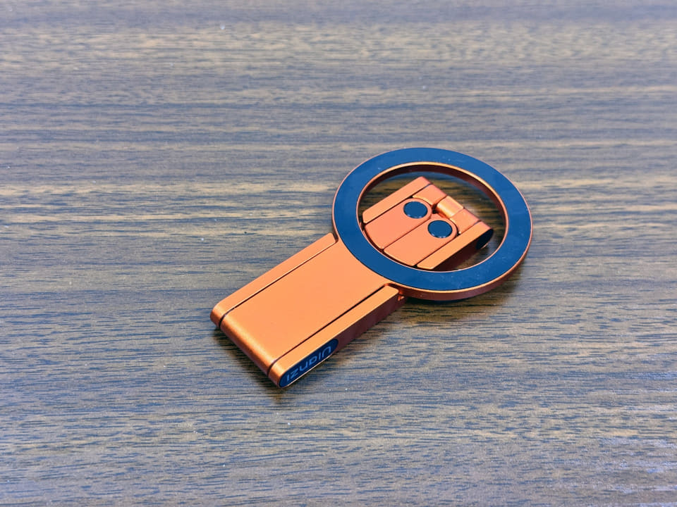 両面マグネット構造を採用し、表面ではスマホをしっかり吸着固定できる構造。別売のライトを取り付けることもできます。