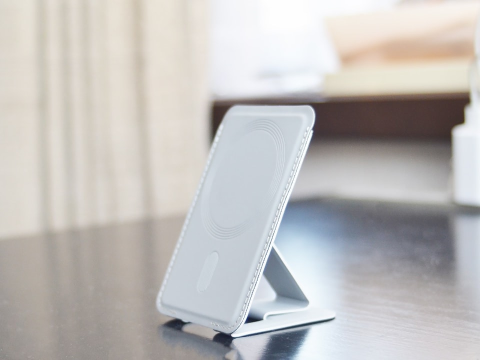 とはいえ、机の上に置いて動画を見るときには支えがあったほうが助かるので、これまでMOFTの折り畳めるスマホスタンドを使用していました。本誌ではこちらで紹介されているものです。iPhoneの背面にマグネットでくっつくので、必要ないときは外してカバンの中に放り込んでおける点が気に入っていました。