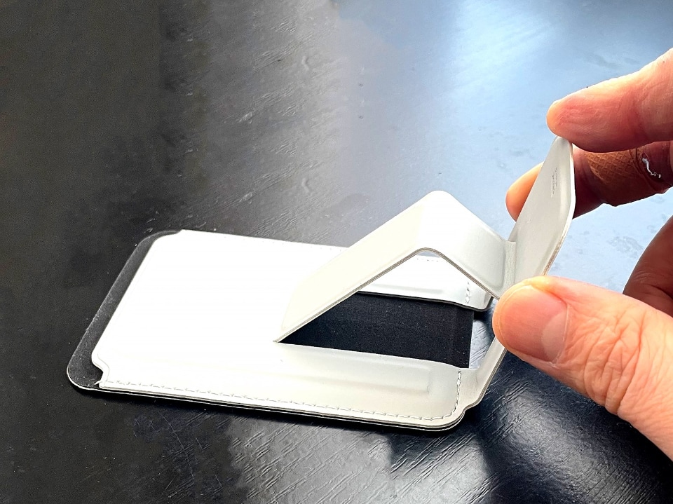 「スタンド付マグネットカードケース」なるこの製品。その名の通りマグネットを内蔵したスマホスタンドで、パッケージでも「MagSafe対応のスマートフォン・ケースに最適」とうたっています。材質はポリウレタン。合皮っぽい手触りで、外観や触ってみた質感に安っぽさは感じられません。