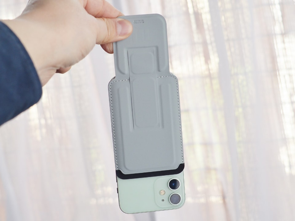 可能性を感じるのは下部に展開するベロの部分。こちらにもマグネットが内蔵されているので、たとえばキッチンの換気扇のふちなどに貼り付ければ、スマホを吊るしておくことができます。