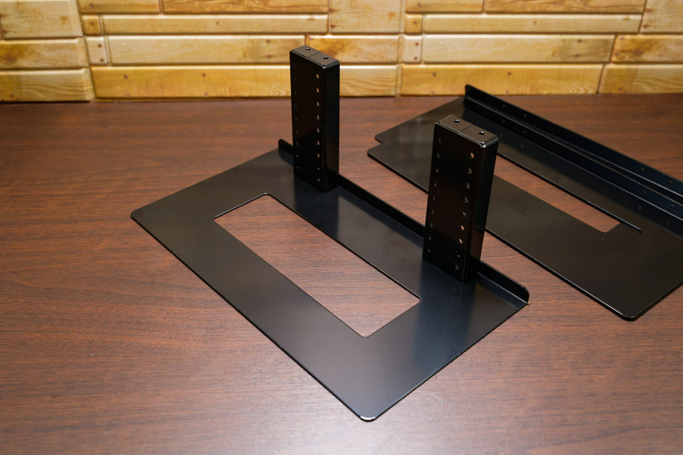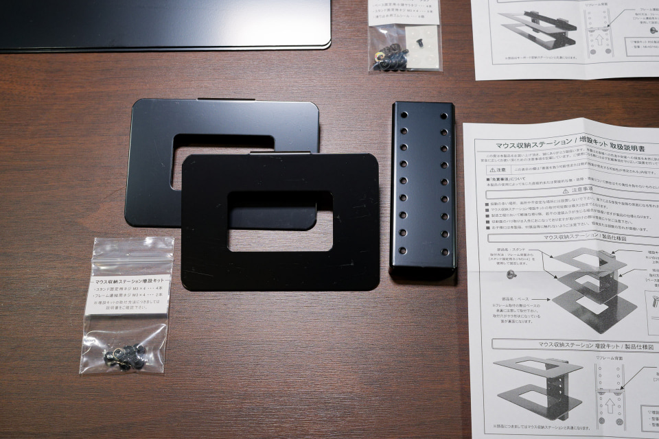 金属加工に強みをもつ長尾製作所なので、もちろん今回の収納ステーションも金属製。キーボード収納はフレーム2本とプレート3枚、マウス収納はフレーム1本とプレート2枚がそれぞれバラバラの状態で送られてくるので、これらをねじ留めして組み立てます。