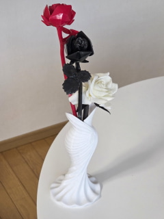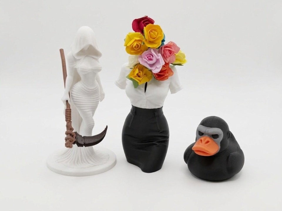 白いブラウスと黒いタイトスカートの女性のフィギュアは、小さな造花やどこかで見つけてきた花、ドライフラワーなどを入れても絵になるだろう。また底面に重量物を入れ込んでバランスを取れば、ペン立てにもなる。金型成形では不可能な、こうした複雑な中空構造を一体で出力できるのも3Dプリンターの強みだ。
