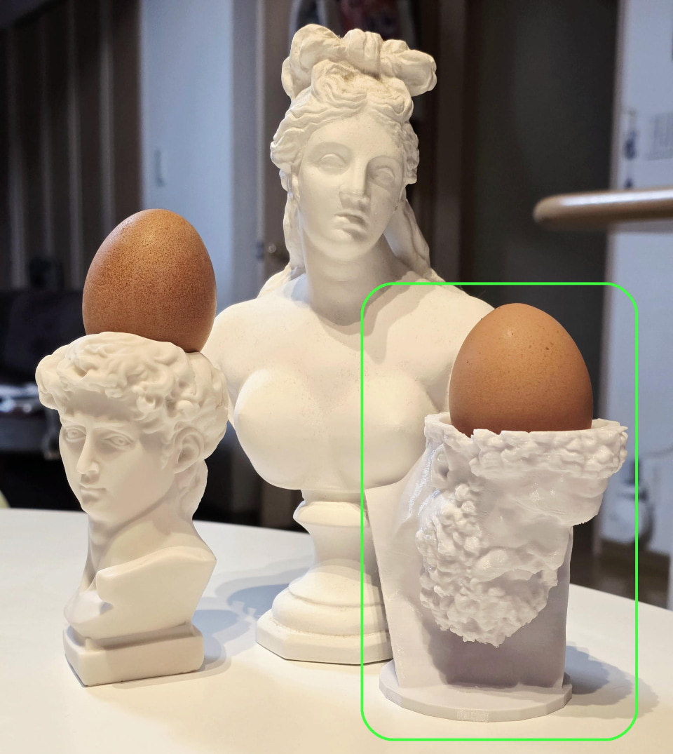 このゴリラ・ダックに端を発し、筆者のデスクには3Dプリンター製の奇妙なプロダクトが増え始めた。次に手に入れたのは、実用性も兼ね備えたアイテムである。写真の緑の枠内が3Dプリンター製だが、ほかの陶器やレジン製のレプリカと比較しても、その造形美において遜色はない。このプロダクトは表面処理が工夫されており、遠目には石膏像のような質感を保っている。ゼウスの頭部には穴が開いており、エッグスタンドとして利用するためのものだ。