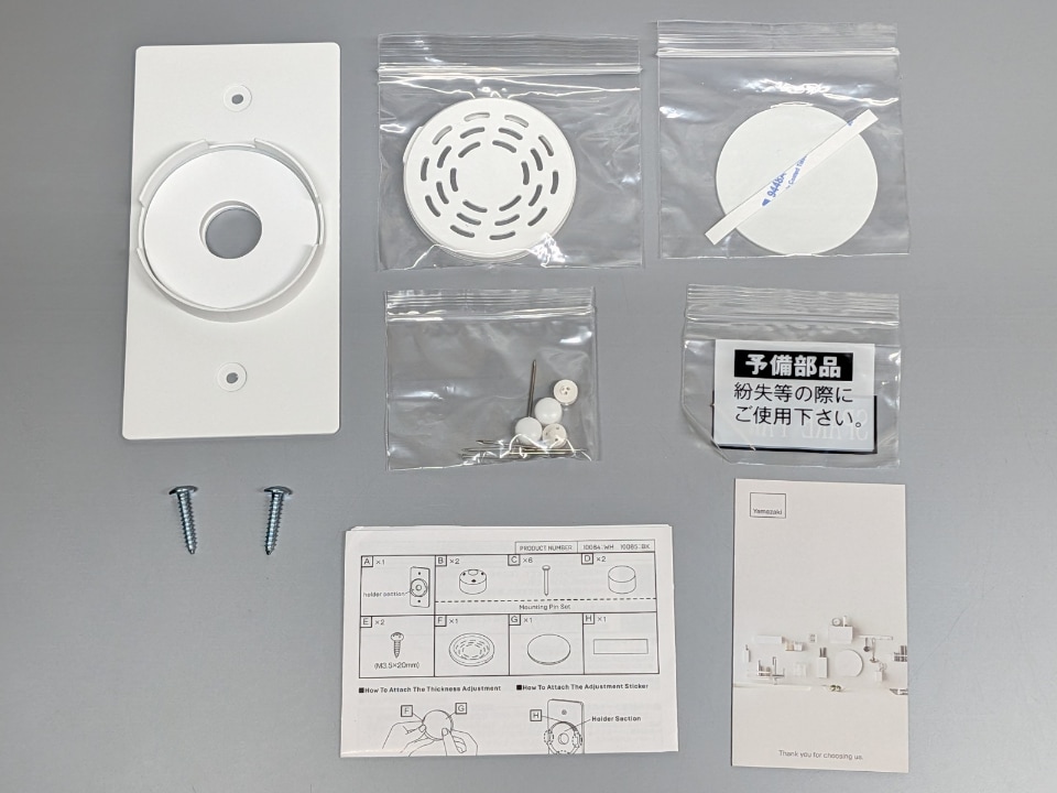 このように複数の固定方法に対応すること、またサイズ違いのモデルをサポートする必要があることから、パッケージには本体マウント、取付ネジ2本、石膏ボードへの取り付け用のピン類一式、シリコンカバー、加えて着脱が不要な場合に固定するためのシールと、同梱品は盛り沢山だ。