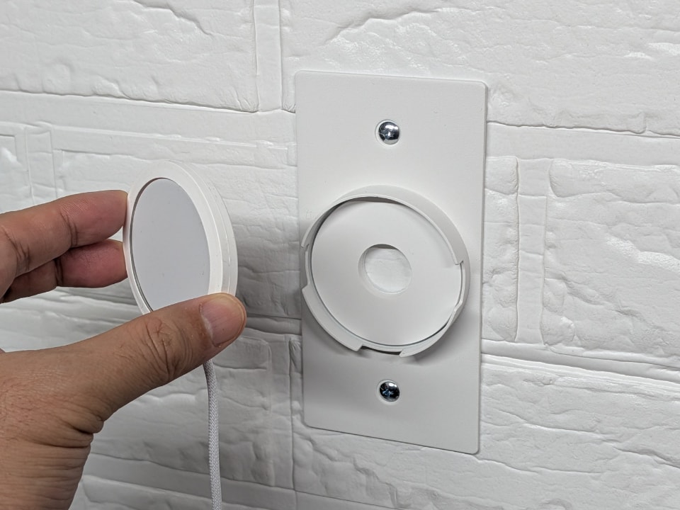 本体に相当するマウントを壁面に取り付け、そこにシリコンカバーで覆われたMagSafe充電器をはめ込む仕組み。必要に応じてマウントから充電器を分離させることもできるので、充電しながら手に持って使うニーズにも対応できる。またこのシリコンカバーを被せることで、従来モデルよりも若干サイズが小さい最新のMagSafe充電器にも対応できる。