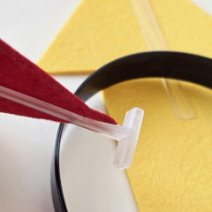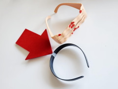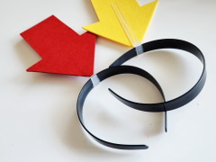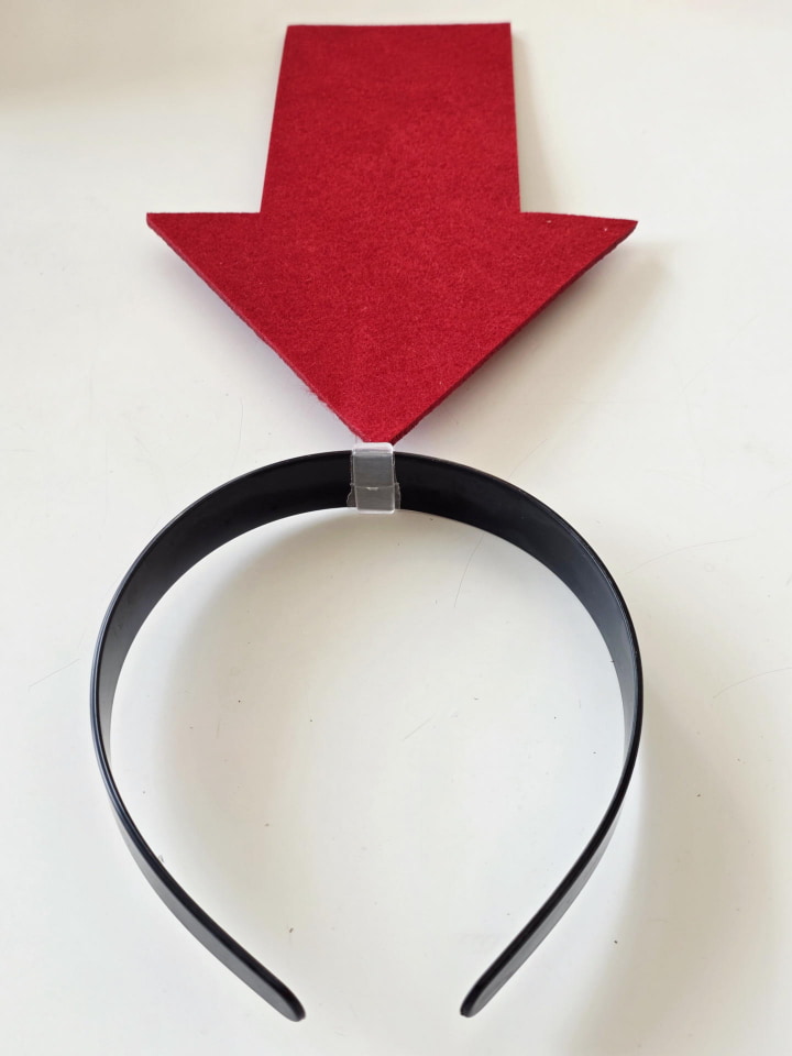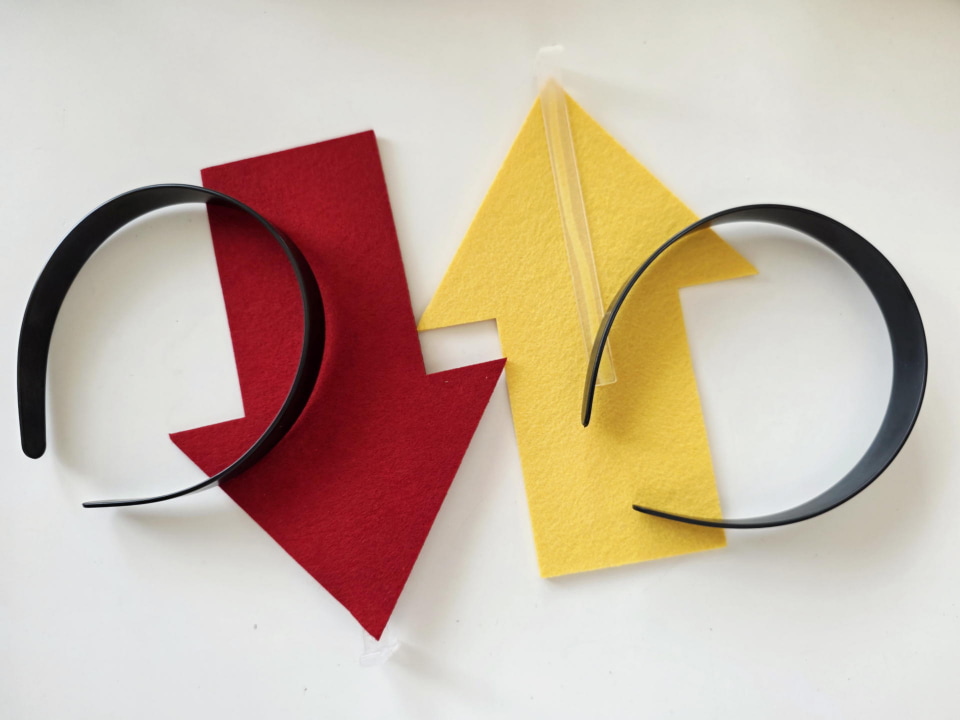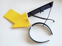 構造はいたってシンプルである。セミハードな質感のフェルトで作られた大きな矢印の裏側に、透明なループが備わっている。ここにプラスチック製のカチューシャを通すだけで完成だ。