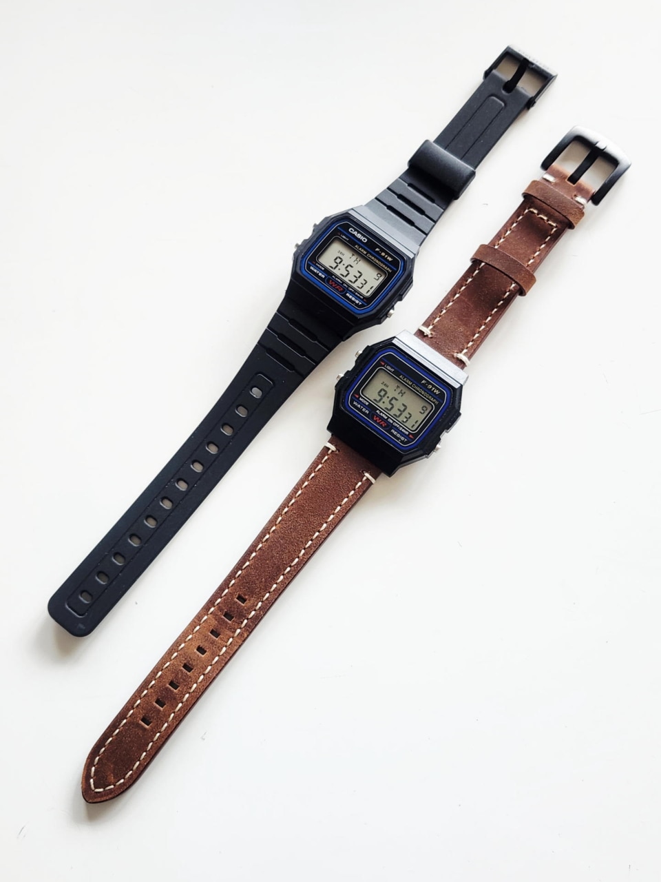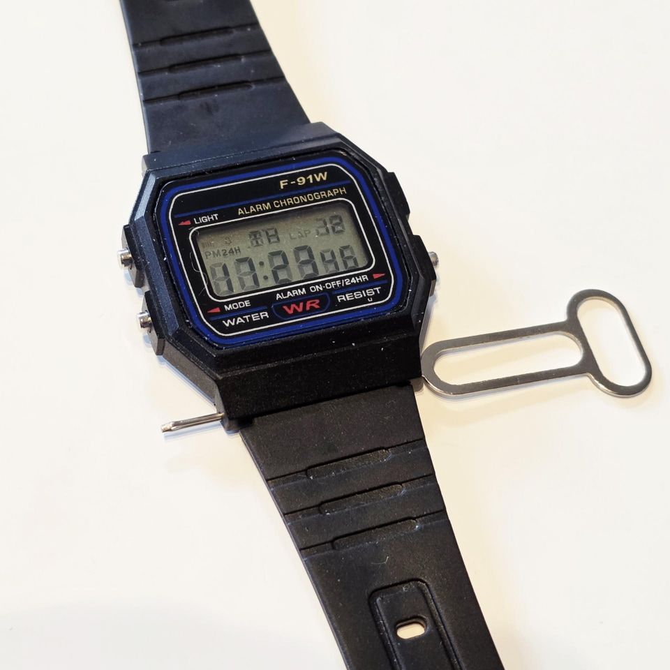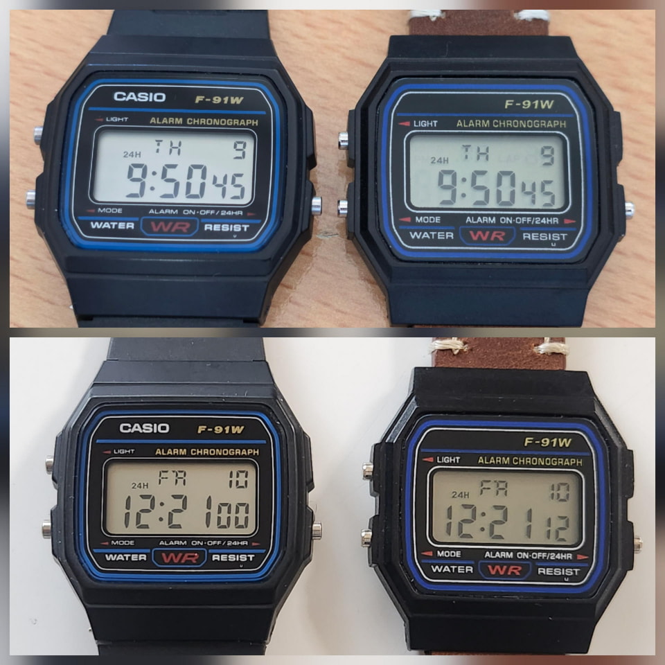 しかし、ここで筆者の悪癖が顔を出す。1500円の本体に500円のベルトでは、価格バランスがまだ「普通」すぎるのだ。そこで、以前250円ほどで購入し、コレクションの肥やしとなっていた「F-91W・オマージュモデル(いわゆるノーロゴのコピー品)」を持ち出してきた。