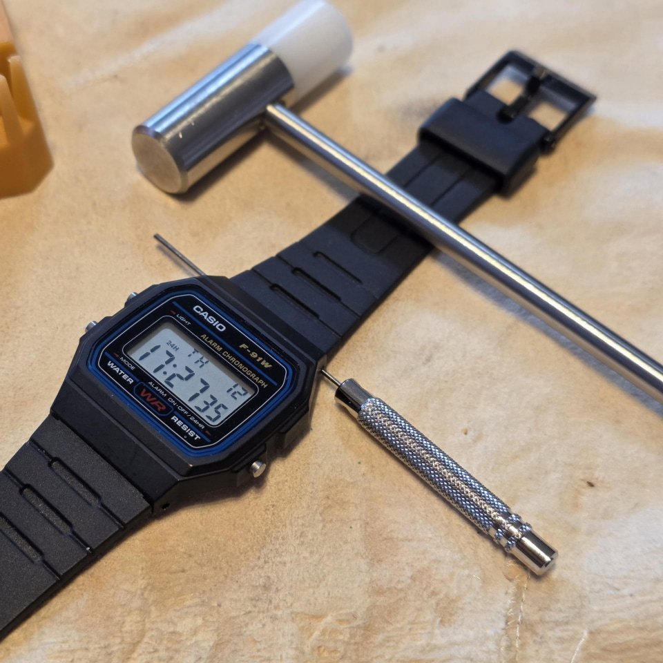 まずは、オリジナルのシリコンゴム製ベルトを取り外す。純正のシリコンベルトは軽量で実用的だが、愛用度が高いと2年ほどで劣化して切れてしまう消耗品でもある。作業には初心者向けの安価な腕時計工具を使用し、バネ棒を丁寧に押し出していく。