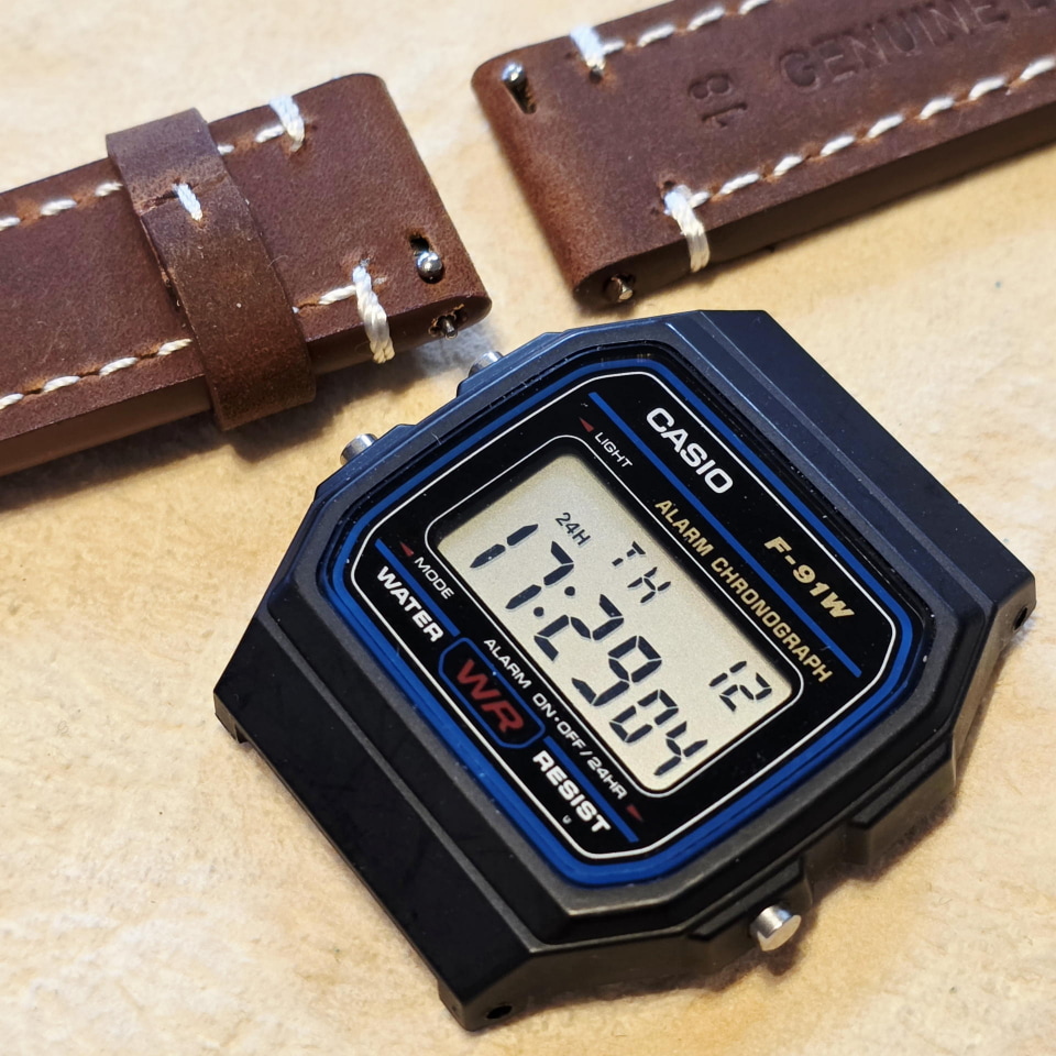 本体価格約1500円のF-91Wに、500円の本革ベルトを装着する。これだけで、見慣れたデジタル時計が見違えるような表情を見せた。色違いのモデルをいくつか並べて比較してみたが、今回の「本革仕様」はやはり別格の佇まいを放っている。少し使い込むことで革が馴染み、腕に吸い付くような感触が得られるのも本革ならではの愉悦だ。