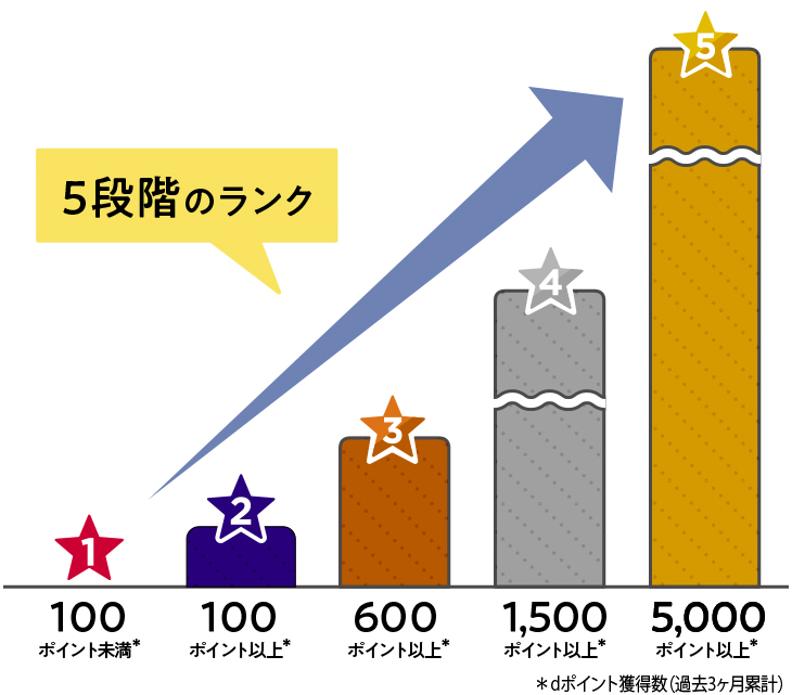 その期間も、6カ月から3カ月に変わり、入れ替わりが頻繁になります。「1つ星」は0ポイント、「2つ星」は100ポイント、「3つ星」は600ポイント、「4つ星」は1500ポイント、「5つ星」は5000ポイントです。3カ月と期間が短くなっているため、「4つ星」や「5つ星」に上がるために必要なdポイントは、現行のdポイントクラブと同じです。