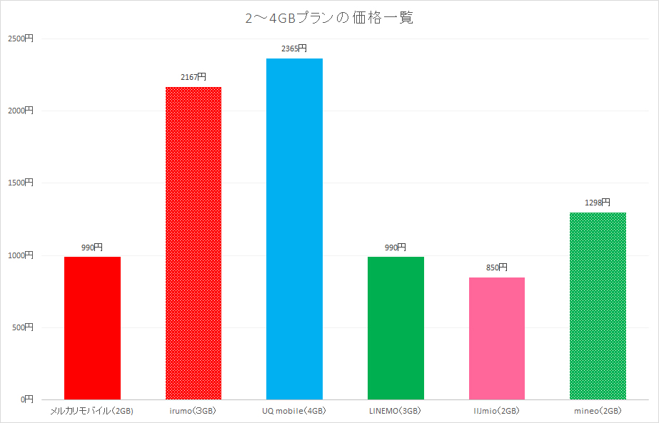 MVNOと比べても、同様です。例えば、最大手のIIJが展開する IIJmioは「ギガプラン」の2GBを850円 で提供しており、メルカリモバイルより140円安く設定されています。25GBは2000円で、価格が390円安いだけでなく、データ容量も5GB少ないといった差があります。