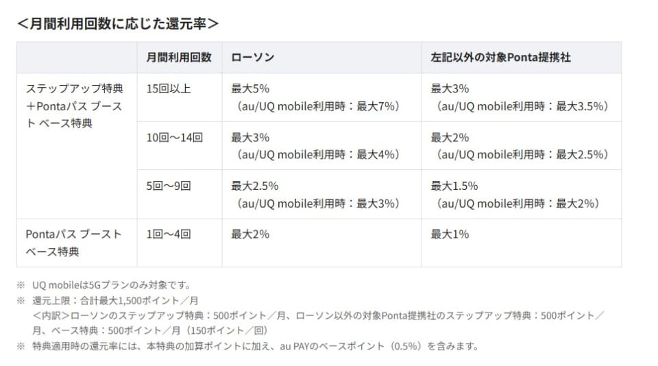 こちらのベース特典は1%で、5月31日までと同じ。5回で0.5%、10回で1%、15回で2%の還元率が追加され、合計すると1%、1.5%、2%、3%で変動します。au、UQ mobileのユーザーは、ステップアップ特典分がそれぞれ0.5%上がり、1%、2%、2.5%、3.5%の4段階に還元率が追加されていきます。
