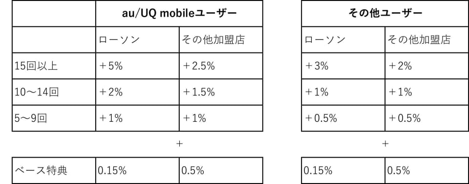 なお、これはauもしくはUQ mobile回線を利用していた場合。その他のユーザーは、ベース特典こそ2%と同じですが、ベースアップ特典が下がり、5回で0.5%、10回で1%、15回で3%が加わる形になっています。