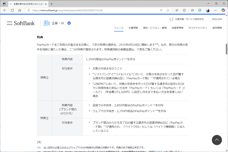 また、ワイモバイルからソフトバンクやLINEMOからソフトバンクのようなブランド変更の場合には、店頭だと3850ポイント、オンラインだと2750ポイントが特典として付与されます。こちらは、先に挙げたPayPayカード割に加えて、ソフトバンクの「ペイトク50」もしくは「ペイトク無制限」に加入していることが条件になります。ソフトバンクに移る場合に限り、手数料を実質無料にする措置を取ることで、アップセル(事業者にとって売上増になる料金プランの変更)の障壁を取り除こうとしていることが見て取れます。