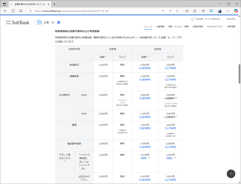 よりインパクトが大きいのが、Webでの手数料。元々ソフトバンクでは、ソフトバンクオンラインショップを利用した際には、新規契約や機種変更の手数料が無料になっていましたが、これが有料化され、3850円の手数料がかかります。また、「当面無料」にはなりますが、eSIMの再発行にも手数料が設定されることになります。
