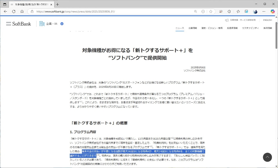 48分割のうち、24回もしくは36回の支払いを免除していたソフトバンクの「新トクするサポート」が、8月にリニューアルされます。8月20日に開始される「新トクするサポート+」がそれです。