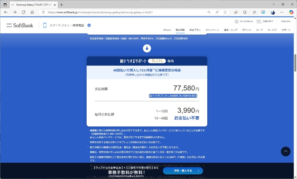 例えば、発売されたばかりの「Galaxy Z Fold7」は、プレミアムの対象。これは、1年で割安に機種変更が可能になるプログラムになり、「早トクオプション利用料」を支払っても、1年での支払い額の総額は7万7580円(新規契約やMNPの場合)まで抑えることができます。