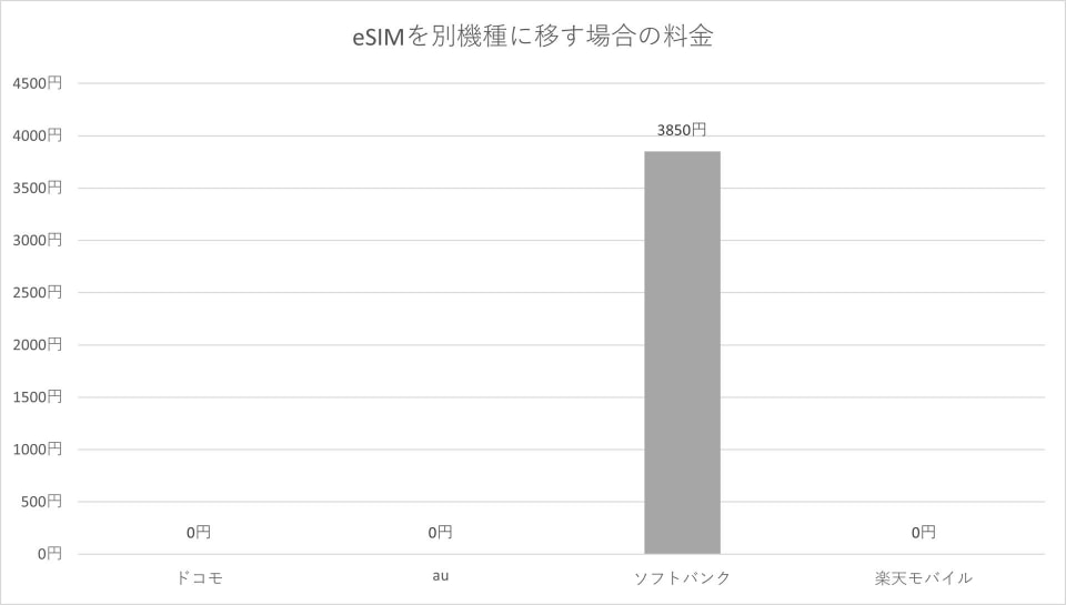 オンラインで手続きする想定の場合、次のような手数料がかかります。まず、ドコモはオンラインショップと同じ扱いで手数料は無料。auも、SIMカードからeSIMへの移行はeSIM再発行と同じになり、料金はかかりません。