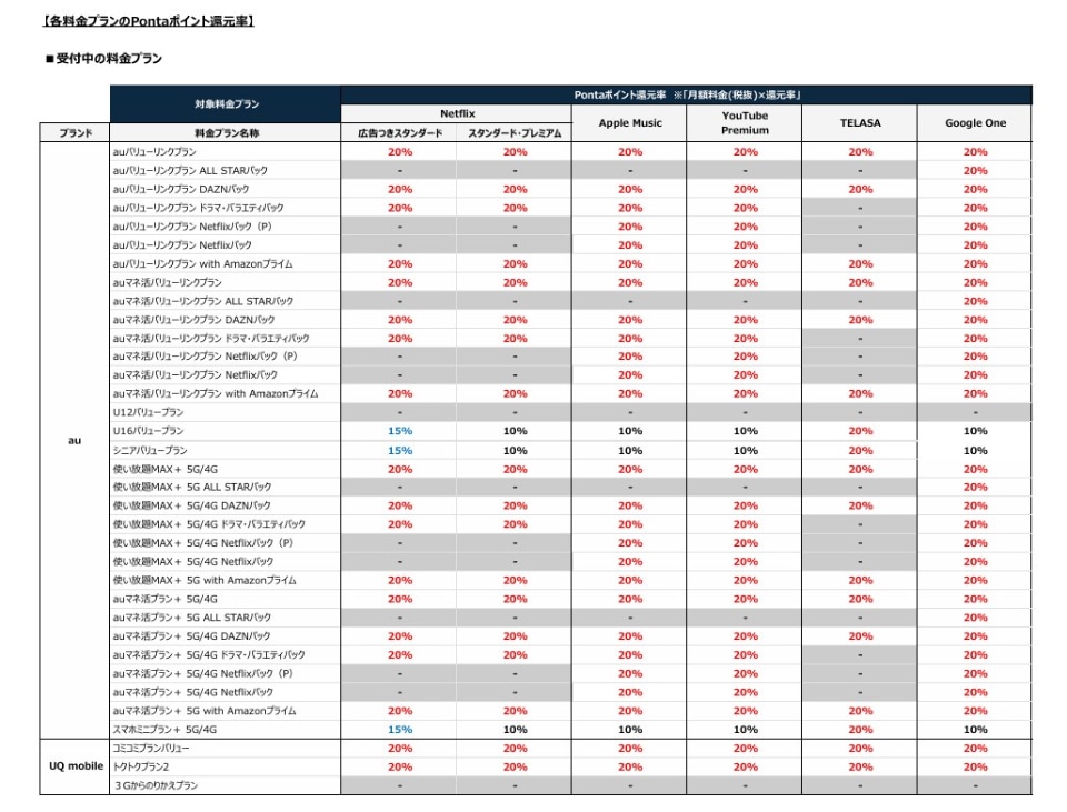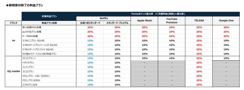 還元率は料金プランによって異なるものの、Netflixは比較的太っ腹で、auはもちろん、UQ mobileもポイント還元の対象になっています。
