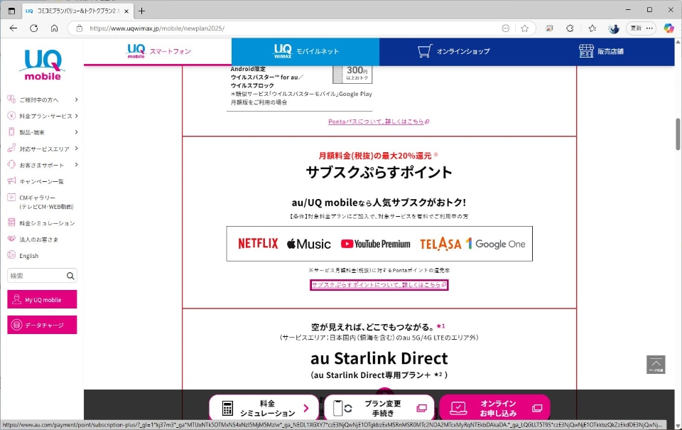 一方で、無料キャンペーンと同様、サブスクぷらすポイントは、サブブランドのUQ mobileでも利用可能。しかも現行の料金プランである「コミコミプランバリュー」や「トクトクプラン2」では、auのauバリューリンクプランと同様、還元率が20%に設定されています。
