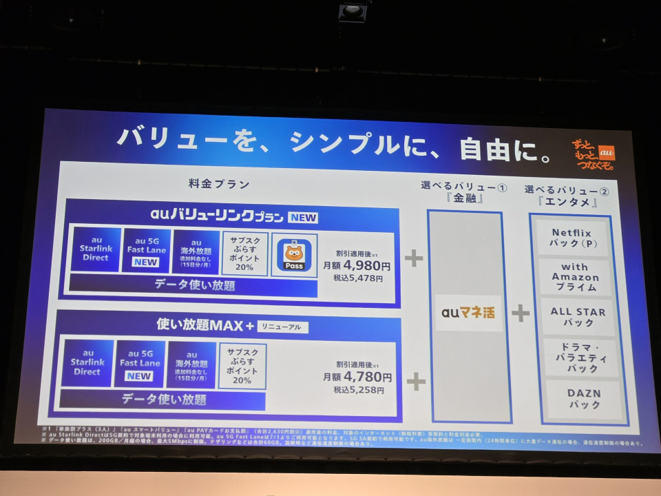 auの中心になっている現行の料金プラン「auバリューリンクプラン」にも、Netflixパックは受け継がれています。12月に導入される「マネ活2」と同様、核となる料金プランにつける“価値”の1つというのがその位置づけ。